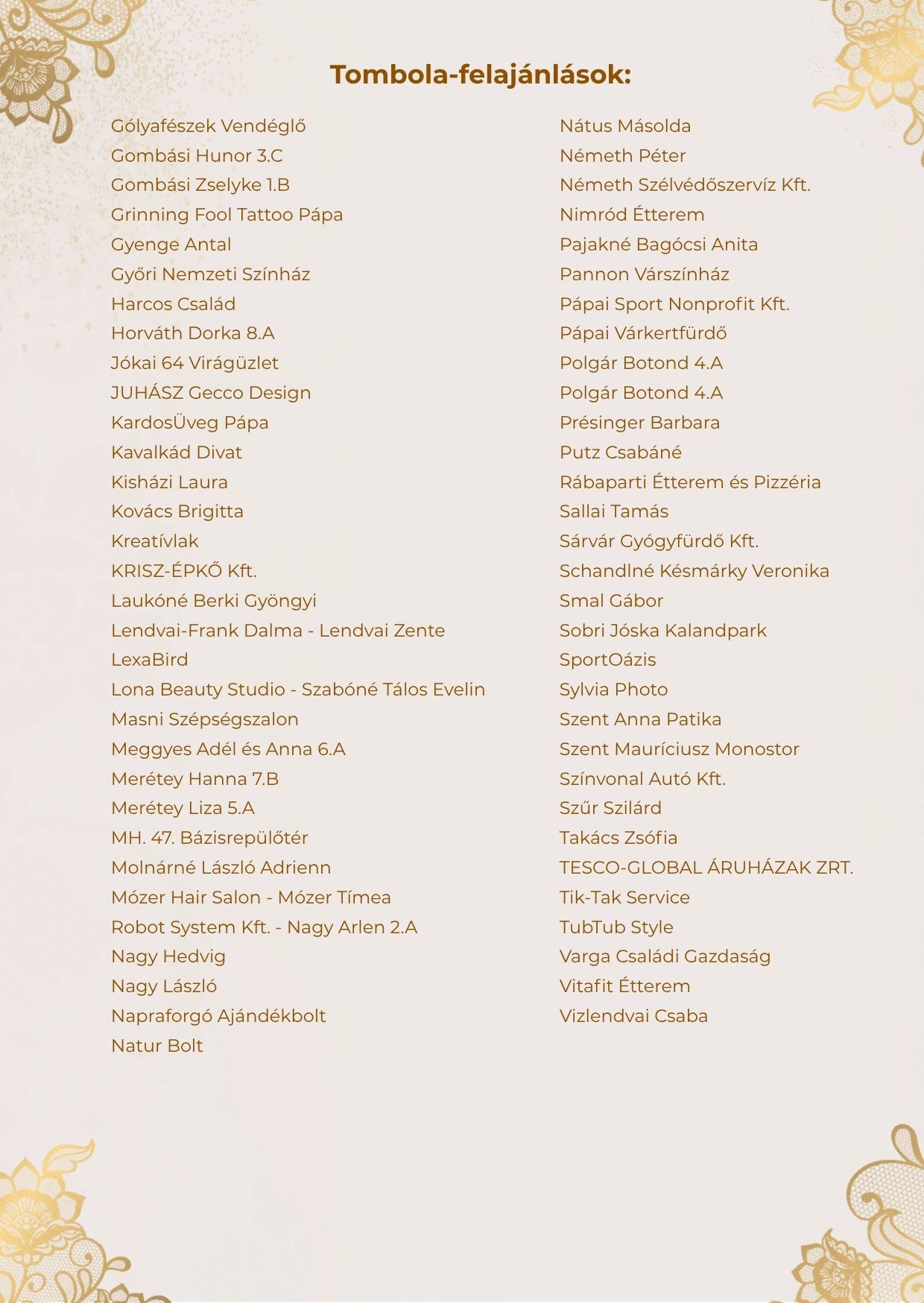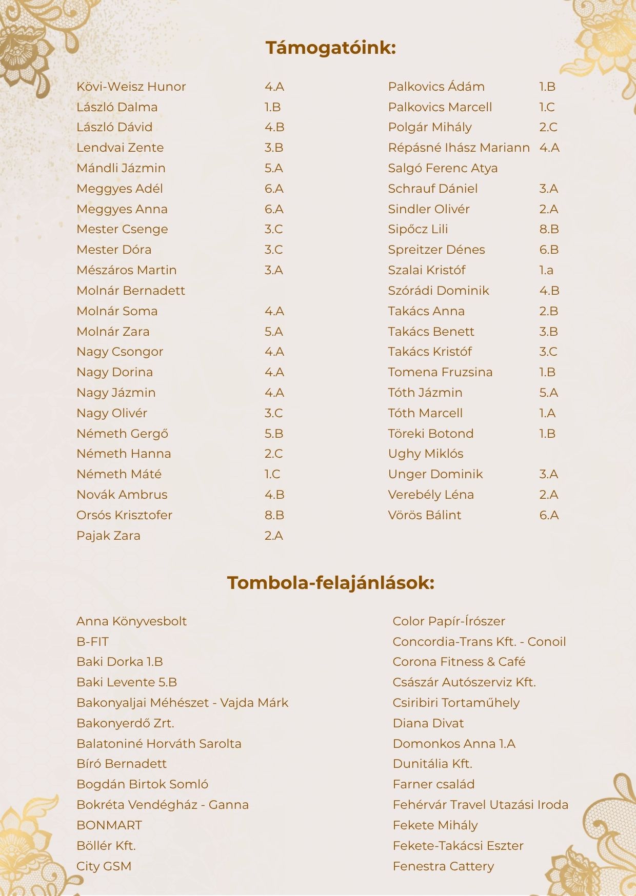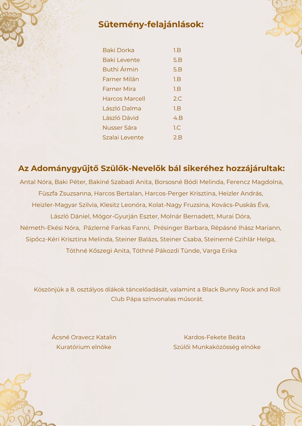 Az Alapítvány elnöke, a Szülői Munkaközösség elnöke, valamint az Alapítvány kuratóriuma nevében köszönetünket fejezzük ki mindazoknak, akik adományozóként, szervezőként, lebonyolítóként, résztvevőként hozzájárultak az 2025. évi Adománygyűjtő Szülők-Nevelők Bálja sikeréhez!